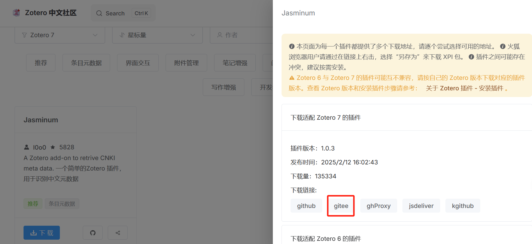 2. Zotero 插件商店中搜索jasminum,然后选择gitee,右键另存为XPI包