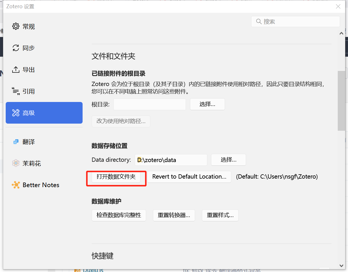 • 然后在zotero中点击编辑—>设置—>高级—>打开数据文件夹——替换掉里面的translators文件